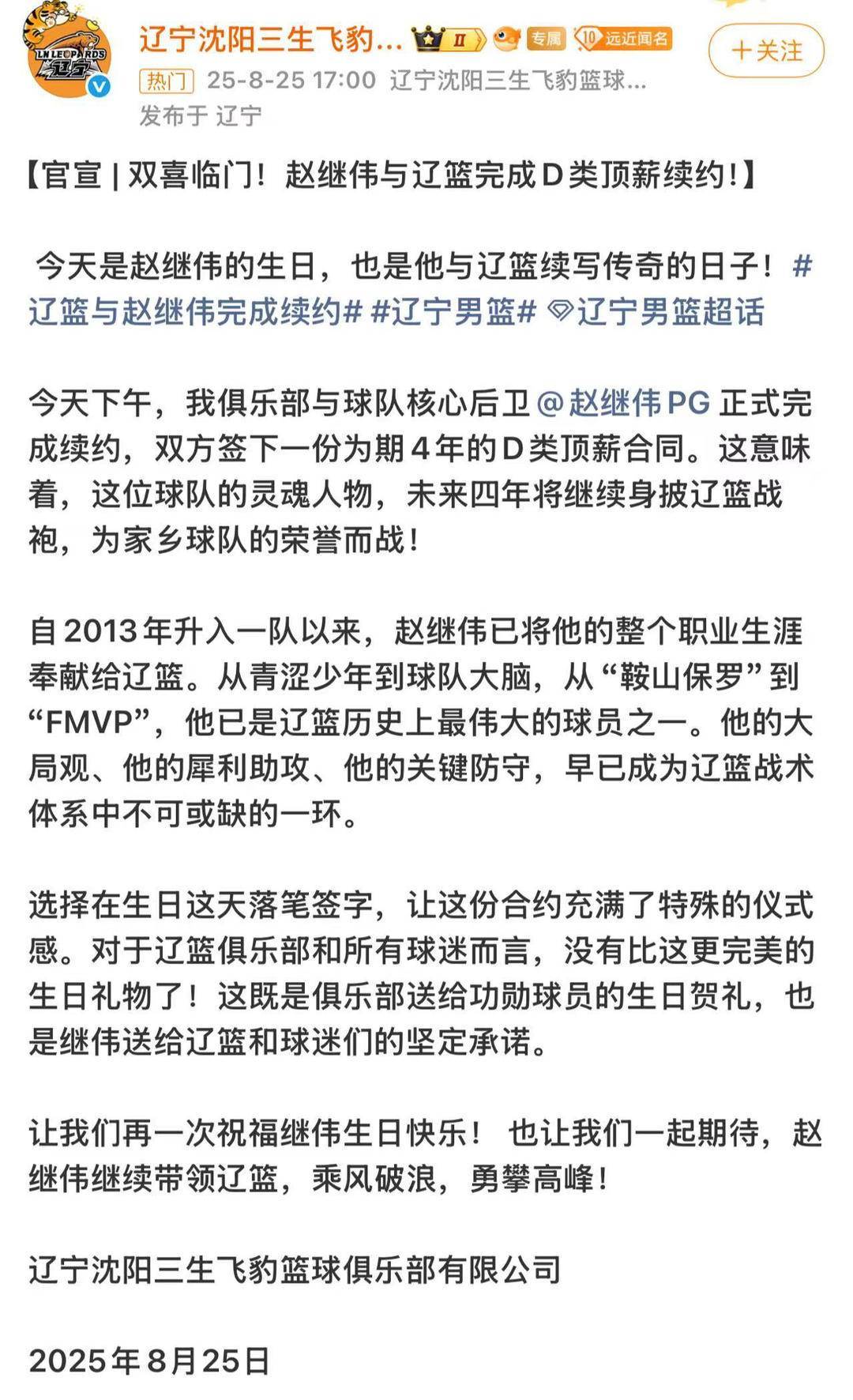 8月25日,赵继伟30岁生日当天,辽宁男篮官方官宣重磅消息,双方签下一份为期四年的D类顶薪合同,合约总值达 2400 万元。这份合约不仅让赵继伟锁定“一人一城”的荣耀,将职业生涯剩余黄金期全部奉献给辽宁男篮,更从多个维度为这位功勋老将回归中国男篮、以最佳状态征战国际赛场奠定了坚实基础。